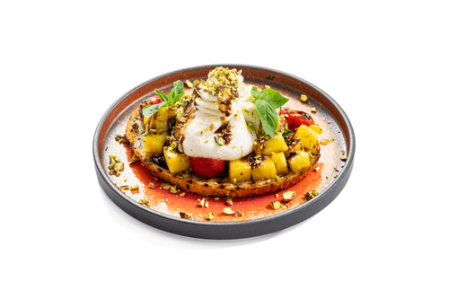 Брускетта с ананасом на гриле и бурратой — это яркое сочетание сладкого, кремового и хрустящего. Это блюдо напоминает солнечное итальянское лето, но с авторским акцентом. Жареный ананас карамелизуется, усиливая его естественную сладость, а мягкая буррата придаёт нежность. Помидоры черри добавляют легкую кислинку, а свежий базилик освежает вкус. Фисташки вносят хруст, а бальзамический крем — насыщенную глубину. Такой перекус идеально подходит для легкого аперитива или закуски перед основным блюдом. Он удивляет контрастами и необычным сочетанием ингредиентов, делая его элегантным выбором для вечеринки или гастрономического удовольствия в уютной обстановке.