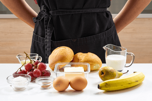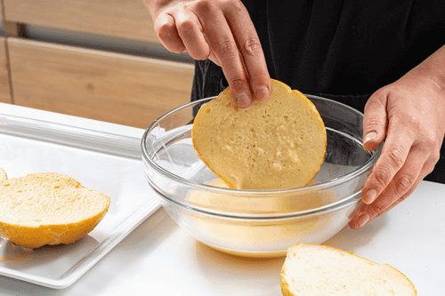 Булочки нарезать на ломтики. Взбить в тарелке яйцо со сливками и замочить в этой смеси хлеб.