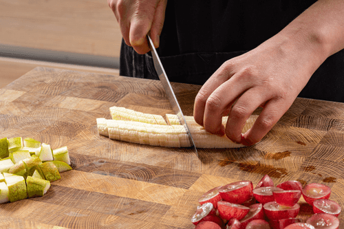 Фрукты нарезать небольшими кусочками, предварительно избавив от косточек.