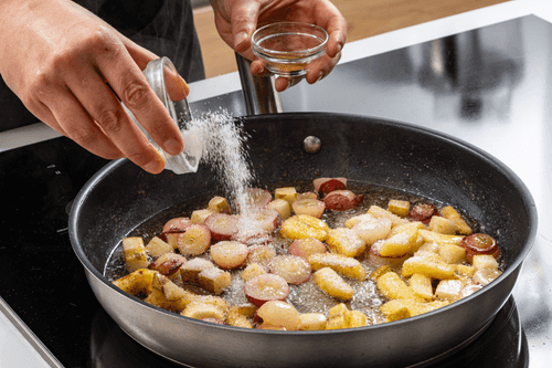Посыпать фрукты корицей и сахаром, дать сахару растопиться и аккуратно перемешать фрукты с сахаром, чтобы они покрылись карамелью.