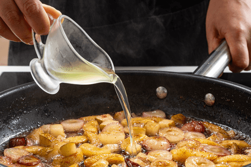 Влить на сковороду ликер, перемешать и дать ликеру выпариться в течение 1 минуты. Выложить фрукты из сковороды.