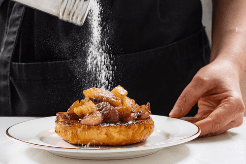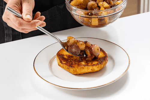 Красиво нарезанные и уложенные в хрустальную вазочку фрукты к концу новогодней ночи часто выглядят как на фламандских натюрмортах. Не на тех, что прославляют роскошные дары природы, а на тех, что при помощи изображений увядших плодов доводят до зрителя мысль о тленности всего сущего. Нам такие рассуждения ни к чему, особенно в праздник, поэтому берем слегка подвядшую фруктовую тарелку в оборот, устраиваем мелконарезанным фруктам спа на сковородке, обжарив их на сливочном масле до легкой карамельной корочки, и водружаем на румяные сладкие гренки. С чашкой капучино — идеальный завтрак в зимние каникулы.