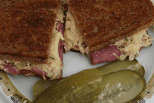Ломтики ржаного хлеба смажьте сливочным маслом и заправкой. На 4 ломтика хлеба выложите по 2 ломтика сыра, квашеную капусту, тонко нарезанную солонину. Затем накройте оставшимися ломтиками хлеба так, чтобы сторона, смазанная заправкой, оказалась внутри сэндвича.