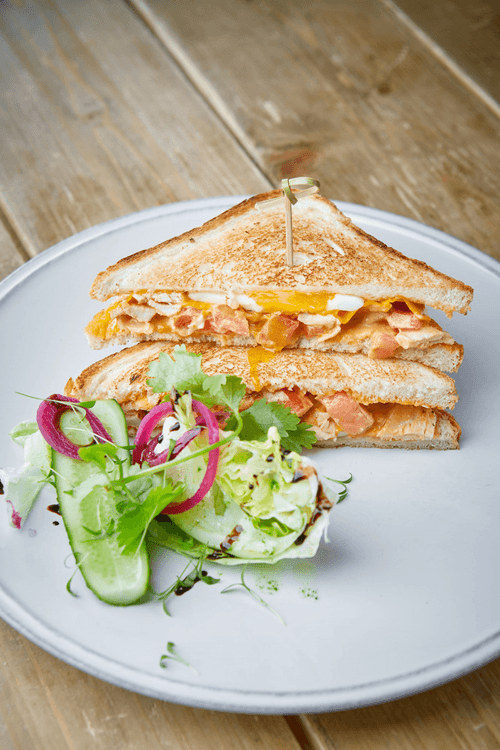 Сверху закрыть сэндвич вторым тостом и обжарить его в собранном виде, на гриле с двух сторон. Подавать с красным луком, салатом Айсберг и маринованным огурцом.
