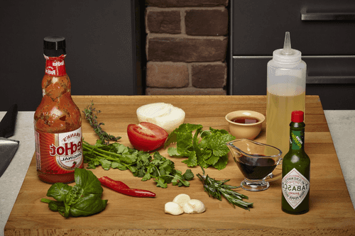 Добавить растительное и оливковое масло, бальзамический уксус, соус табаско, острый соус чили, тимьян, розмарин, кайенский перец, соль и сахар.