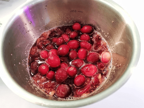 Добавить имбирь к клюкве и залить водой, чтобы она слегка покрывала ягоды.
