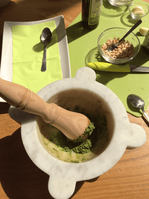 Поместить в чашу чеснок вместе с несколькими зернами соли, перемешать ступкой. Добавить кедровые орехи и снова взбить.