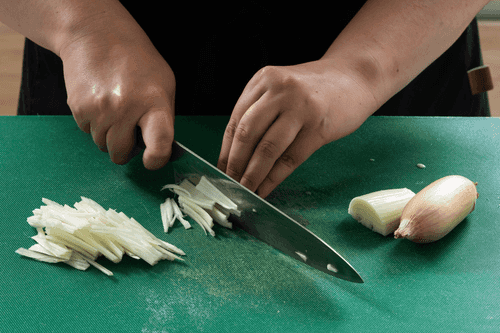 Лук-шалот тонко нарезать. В большую глубокую сковороду влить 1 столовую ложку растительного масла, поставить на тихий огонь и выложить лук. Томить лук, время от времени помешивая, пока он не карамелизуется до темно-золотистого цвета (лук ни в коем случае не должен гореть и поджариваться!).