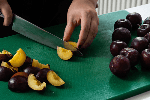 Сливы разрезать пополам, удалить косточку, нарезать на четвертинки.