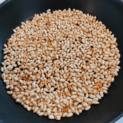 Кедровые орехи поджарить на сухой сковороде до румяного состояния, постоянно помешивая. Затем остудить.