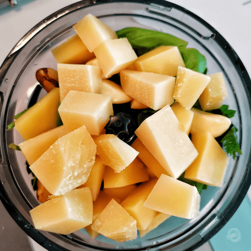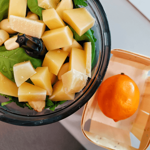 Сыр нарезать небольшими кубиками и добавить в блендер.