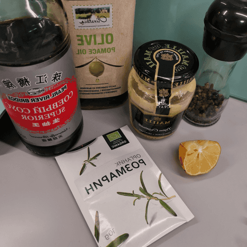 Этот изысканный маринад для баранины, корнями уходящий в традиции французской кухни, сочетает в себе гармонию вкусов и утонченность ароматов. Основой служит нежное оливковое масло, которое дополняется насыщенным соевым соусом и пикантной дижонской горчицей, создавая сбалансированную структуру. Свежий лимонный сок придаёт легкую кислинку, усиливая вкусовую глубину, а розмарин и смесь перцев добавляют пряность и утонченный аромат, пробуждая аппетит. Этот маринад идеально подчеркивает естественную сочность баранины, смягчая её текстуру и придавая ей благородный вкус. Подойдет для запекания или гриля, наполняя блюдо ароматами средиземноморских трав и пряностей, превращая обычное мясо в гастрономическое наслаждение.