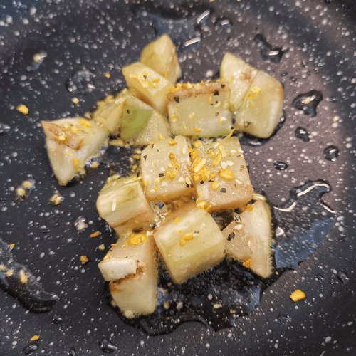 Баклажан, нарезанный кубиками и очищенный от кожицы, выложить в разогретое на сковороде оливковое масло.