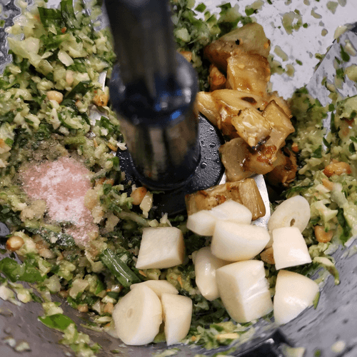Добавить чеснок, баклажан и соль, затем винный уксус. Взбить до однородной консистенции.