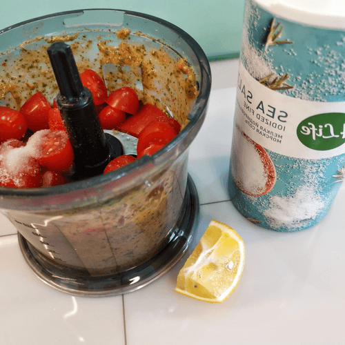 Добавить нарезанные томаты, чеснок и приправить сухой аджикой и перцем чили.