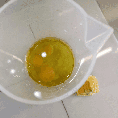 Яйца разбить в глубокую емкость. Добавить сок дольки лимона и масло.
