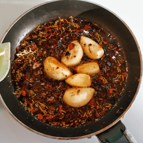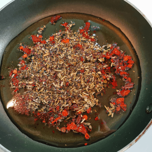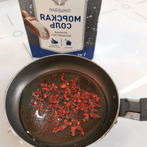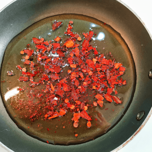 Разогреть на сковороде масло, добавить в него хлопья чили.