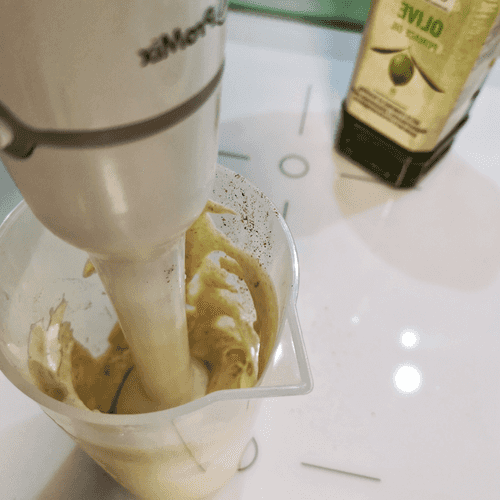 Интенсивно взбивать, не двигая блендер до тех пор, пока белая масса не начнет из-под него подниматься.