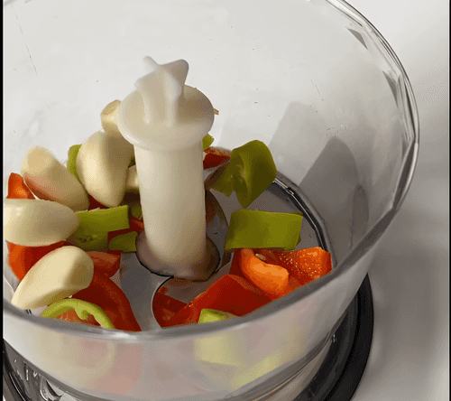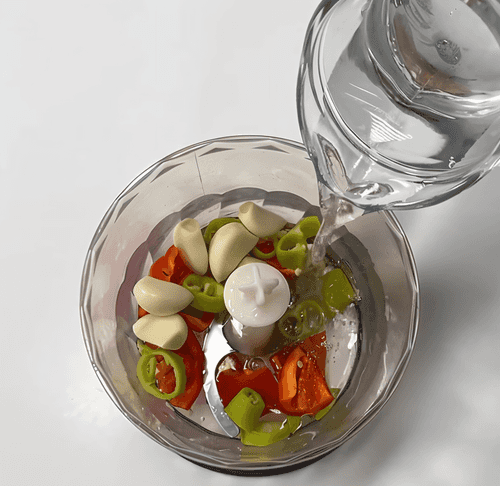 В чашу блендера положить сладкий и острый перцы (острый перец от семян чистить не нужно), чеснок и влить 350 мл воды.