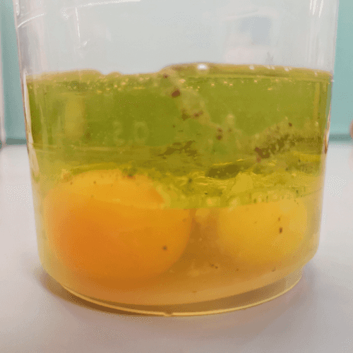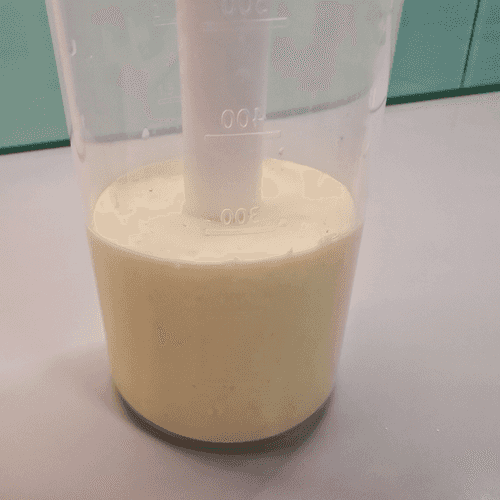 Аккуратно опустить погружной блендер так, чтобы желтки оказались под ним. Взбивать, не шевеля рукояткой, до тех пор, пока наверх не поднимется белая эмульсия.