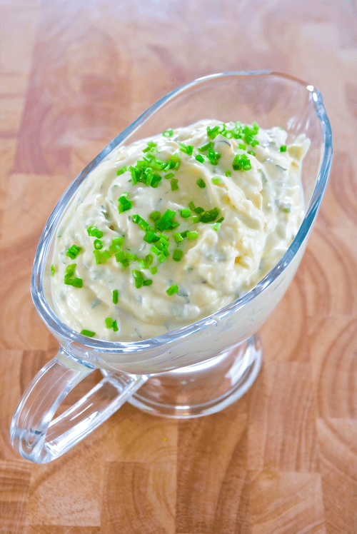Раздробите листья петрушки в ступке, добавьте ложку майонеза, хорошо смешайте и переложите в посуду с соусом. Добавьте мелко покрошенные каперсы и корнишоны — тщательно перемешайте, так чтобы цвет стал однородным. Храните в холодильнике.