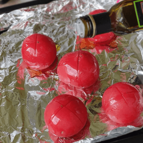 Противень застелить фольгой, выложить томаты и сверху полить оливковым маслом.
