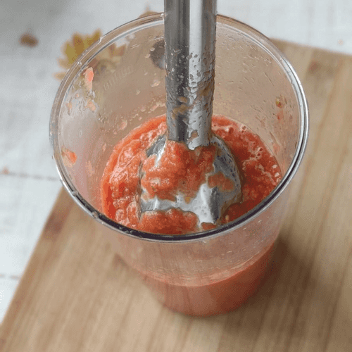 Очищенные помидоры сложить в емкость и пюрировать погружным блендером.