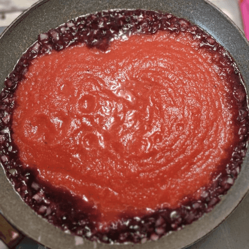 Выложить в сковороду томатное пюре и хорошо перемешать до однородной консистенции.