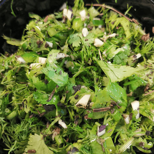 Зелень выложить в глубокую миску и заправить оливковым маслом.