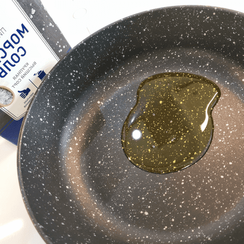 На сковороде разогреть горчичное масло с щепоткой крупной соли.