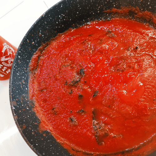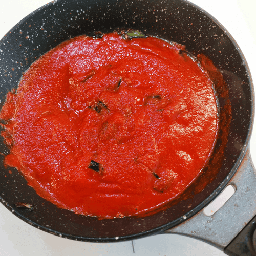 Через 1 минуту влить томатное пюре.