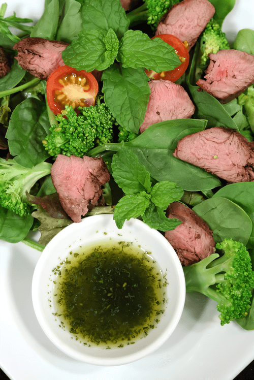 Подавайте, полив сверху листья зеленого салата.