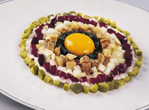 Тартар из норвежской сельди с яичным желтком — это блюдо, которое воплощает традиции северной кухни с нотками изысканности. Норвежская слабосоленая сельдь, известная своим насыщенным вкусом и нежной текстурой, в этом рецепте становится основой для гармоничного сочетания ингредиентов. Кисло-сладкие корнишоны, сладковатая свекла и острый лук создают игру вкусов, дополняемую кремовой мягкостью сметаны. Вершиной этого кулинарного ансамбля становится свежий укроп и сырой яичный желток, добавляющий шелковистую текстуру. Такое блюдо не требует термической обработки, а его презентация в виде кольцевого узора превращает тартар в настоящую гастрономическую картину. Идеально подходит как закуска, сопровождаемая бокалом холодного белого вина или традиционными северными напитками.