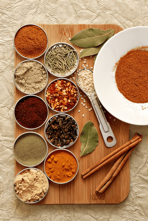 В небольшой миске смешать черный перец, паприку, чили, чеснок, сахар, кумин, измельченные листья шалфея, горчицу, кориандр и красный перец.