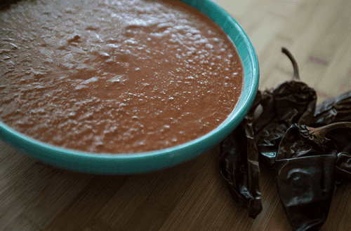 Нарубить помидоры и томатильо и жарить, пока из них полностью не выпарится влага. Все обжаренные ингредиенты смешать и растолочь в ступке, добавив немного бульона, - паста должна получиться однородной и маслянистой. Переложить в сотейник, поставить на слабый огонь, посолить и готовить, непрерывно помешивая лопаткой.