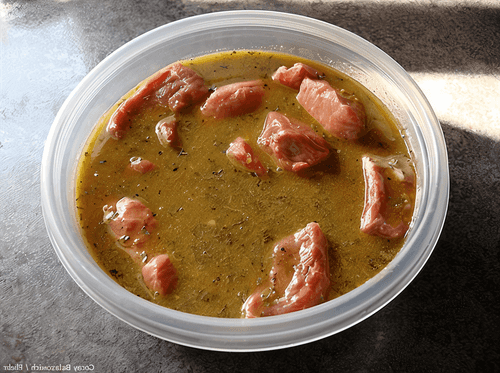В форму выложите мясо, залейте маринадом, закройте и отправьте в холодильник на 2 часа–всю ночь.