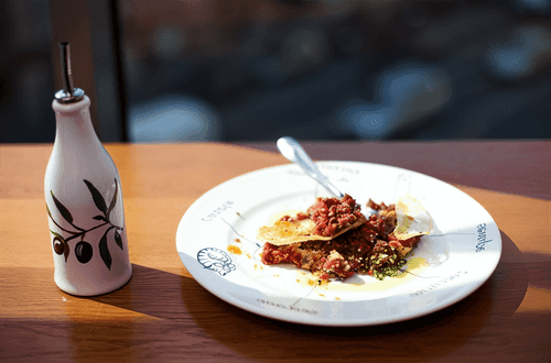 Так же измельчаем черные оливки и каперсы и после замешиваем их в нарубленное мясо и заправляем маслом (для заправок лучше использовать масло первого отжима экстра верджин), морской солью и черным перцем — кто любит по острее, советую добавить пару капель табаско.