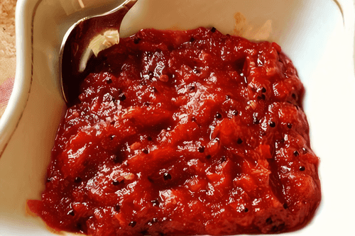 Таматар чатни — ароматный томатный соус с восточными специями, создающий баланс между сладостью и пикантностью. Его корни уходят в индийскую кухню, где чатни сопровождает карри, рис или закуски, дополняя их насыщенным вкусом. Помидоры проходят процесс бланширования и тушения с горчичными семенами, зирой, гвоздикой и корицей, которые раскрываются в горячем топленом масле. Асафетида добавляет характерный пряный оттенок, а сахар завершает гармонию вкусов. Консистенция густого томатного соуса делает его идеальным дополнением к мясным и овощным блюдам. Таматар чатни можно подавать как дип-соус, заправку или пикантное варенье, придающее блюдам утонченную пряность. Это не просто соус — это ароматное путешествие, которое погружает в мир специй и восточной гастрономии.