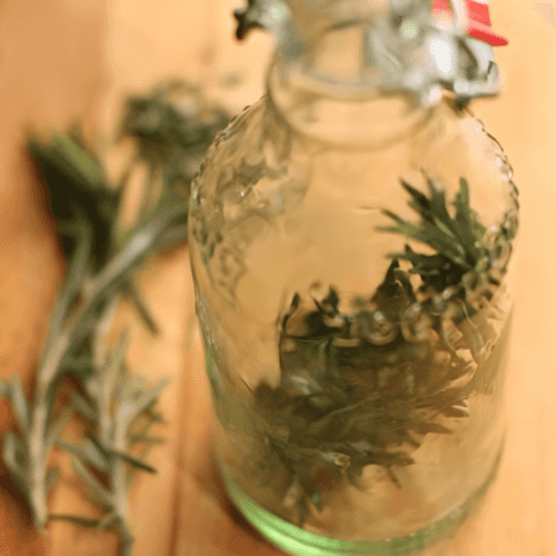 Возьмите 2–3 ветки розмарина и положите в чистую бутылку. Добавьте еще немного рубленого розмарина и измельченный чеснок.