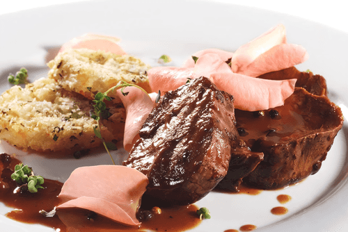 Добавьте 150 мл крепленого вина к 100 мл телячьего жюса. Варите при пузырьковом кипении 10 минут, затем вбейте кусочек сливочного масла.
