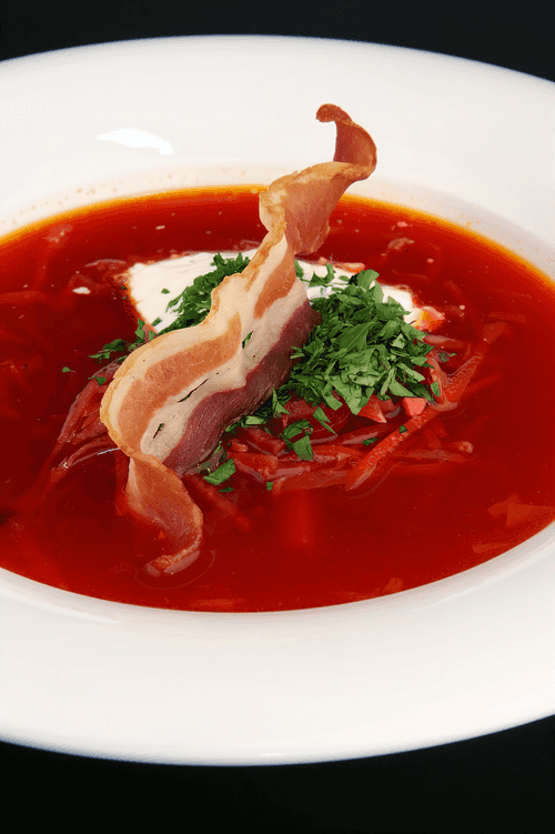 Этот борщ — настоящая симфония вкусов, в которой классические нотки славянской кухни встречаются с авторским прочтением. В его основе — насыщенный телячий бульон, придающий глубину и бархатистость. Свекла дарит традиционную рубиновую окраску и сладковатый оттенок, который искусно дополняется кислинкой винного уксуса. Обжаренные овощи и пассерованная томатная паста насыщают бульон ароматами, а капуста добавляет нежную текстуру. Главная изюминка — мясные копчености и хрустящие чипсы из бекона, которые придают блюду пикантность и дымную теплоту. Поданный с густой сметаной и свежей зеленью, этот борщ превращается в гастрономическое произведение искусства, где каждый ингредиент играет свою роль, создавая гармонию вкусов. Прекрасный выбор для уютного семейного обеда или впечатляющего ужина.