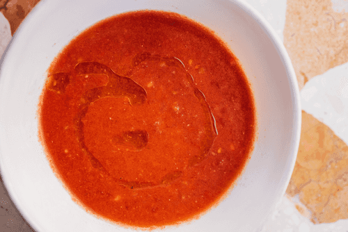 Пробить все ингредиенты в блендере (кроме оливкового масла) на маленькой скорости, чтобы помидоры не айризировались и не получилась пена розового цвета. Консистенция должна оставаться красной.