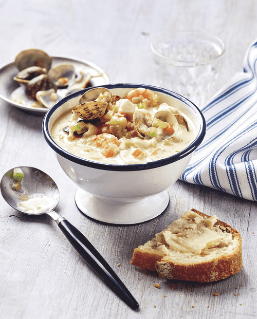 Нарезать рыбу небольшими кусочками и положить в суп (она будет готовиться около 5 минут). Снять с огня, добавить креветки. Последними положить ракушки с моллюсками. Подавать сразу со свежим хлебом.