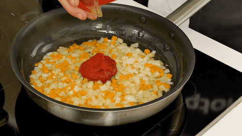 Пассеровать на растительном масле с оставшейся томатной пастой в течение 7–10 минут. Добавить их к капусте и потушить все вместе еще 10–15 минут.