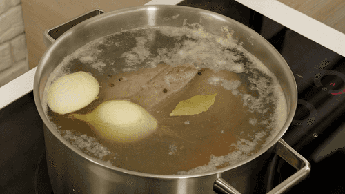 Мясо залить 3 литрами воды, поставить на огонь и довести до кипения. Снять пенку, уменьшить огонь так, чтобы на поверхность поднимались небольшие пузырьки. Добавить луковицу, морковь, перец горошком и лавровый лист. Варить 1,5 часа.