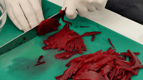Вареную свеклу нарезать тонкой соломкой, такой же соломкой нарезать лук и морковь.