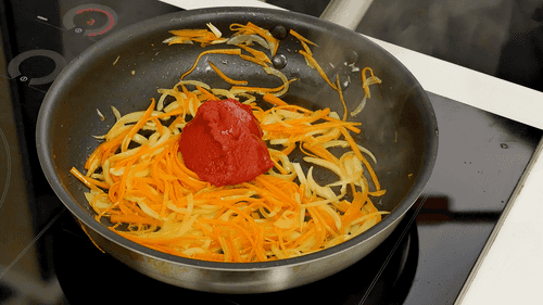На сковороде разогреть растительное масло, пассеровать лук и морковь с томатной пастой.