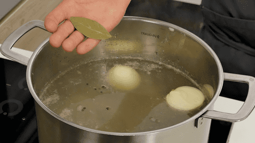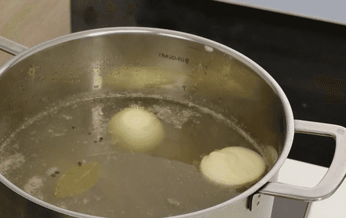 В кастрюлю поместить мясо, залить 5 литрами воды и довести до кипения. Снять пену, добавить луковицу, морковь, лавровый лист и перец горошком. Варить на слабом огне 1,5–2 часа.