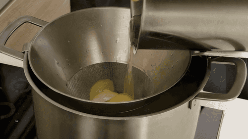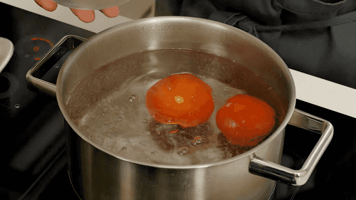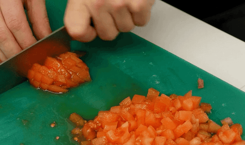 Бросить их в кипящую воду на 30 секунд, а затем переложить в холодную воду. Снять с помидоров кожицу и нарезать их небольшим кубиком.