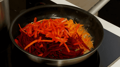 Добавить морковь, свеклу и перец, нарезанные соломкой, продолжить обжаривать еще 3–5 минут, затем добавить помидоры и томатную пасту. Тушить до мягкости овощей.